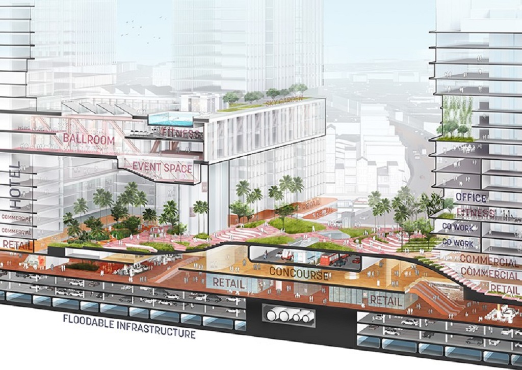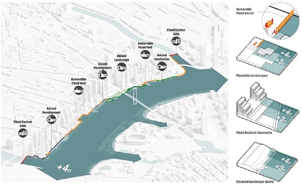 Các thiết kế bền vững ứng phó với mực nước biển dâng gồm có : 2 cửa kiểm soát nước lũ (màu đỏ), các công trình được nâng nền (màu xanh đậm), các bức tường linh động ngăn nước dâng (màu cam), vùng cảnh quan được nâng cao (màu xanh lục)
