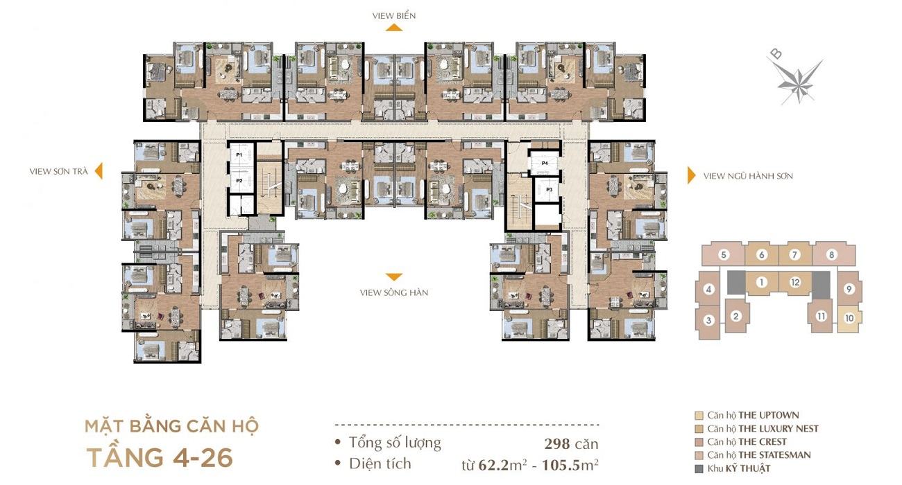 Dự án The SANG Residence Đà Nẵng quy hoạch 28 tầng nổi, 1 tầng kĩ thuật và 2 tầng hầm với 298 căn hộ có diện tích đa dạng từ 62.00 m2 – 105,5 m2.
