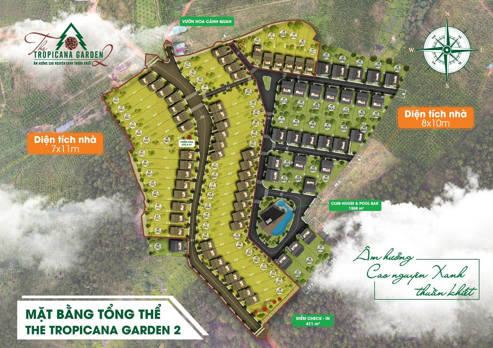 Ưu tiên không gian sống xanh, mỗi biệt thự sinh thái tại The Tropicana Garden 2 với tổng diện tích 500m2-734m2 chỉ có 150m2-200m2 xây dựng biệt thự (1 trệt và 1 lầu), còn lại chính là sân vườn xanh ngát, đượm sắc hoa. Đây là không gian lý tưởng để nâng cao sức khỏe và gìn giữ vẻ đẹp thanh bình, đậm chất cao nguyên xanh.
