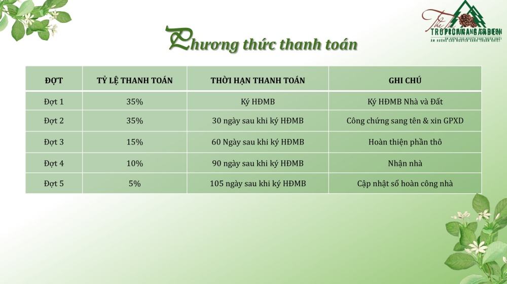 Chỉ với 4,5 – 5 triệu/m2. Quý khách đã có cơ hội sở hữu ngay 1 lô đất + nhà có diện tích từ 200m2 – 300m2 tại THE TROPICANA GARDEN. Tọa lạc ngay trong lòng khu nghỉ dưỡng, hạ tầng đồng bộ, tiện ích nội – ngoại khu hiện đại. Đáp ứng vượt trội nhu cầu vui chơi, nghỉ ngơi, và thư giãn cho cả gia đình. Được sống trong bầu không khí an toàn bậc nhất Việt Nam.