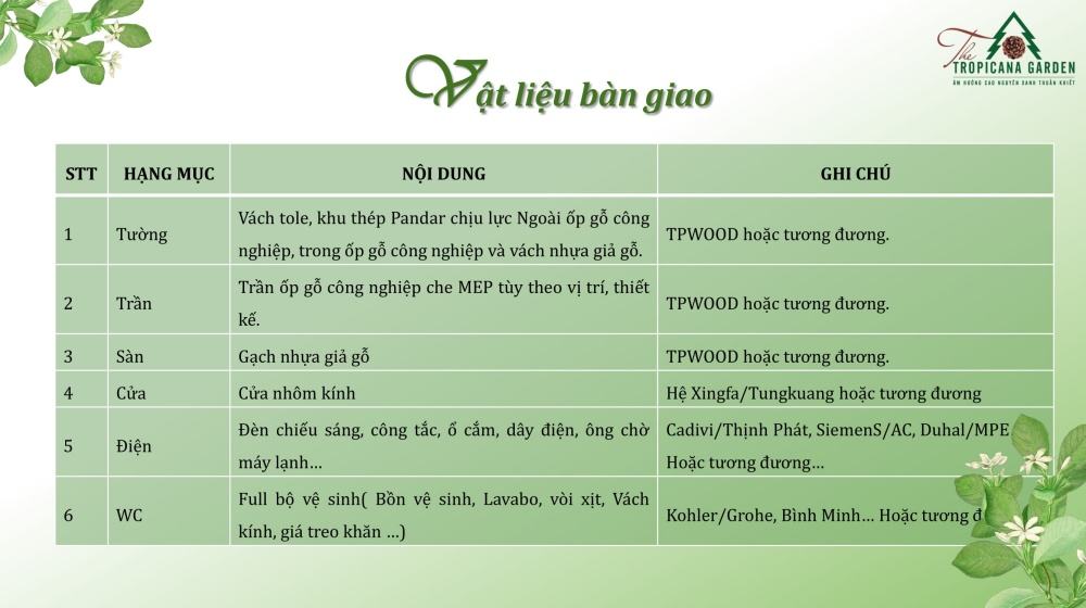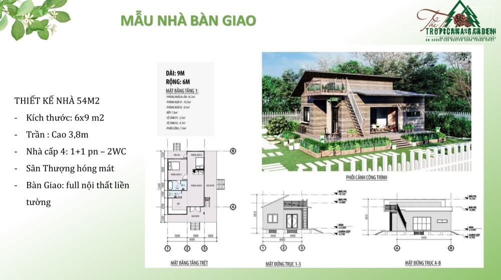 The Tropicana Garden là một trong số rất ít dự án biệt thự sinh thái tại thành phố Bảo Lộc có thiết kế chuẩn cao cấp và thân thiện với môi trường. Tất cả các biệt thự sinh thái, từ phòng khách đến phòng ngủ đều được thiết kế và bày trí tiếp sáng trực tiếp qua những ô cửa kính thông thoáng, với ban công tầng 1 rộng kết hợp hở trần giúp biệt thự thoáng gió, ngập tràn không khí trong lành.