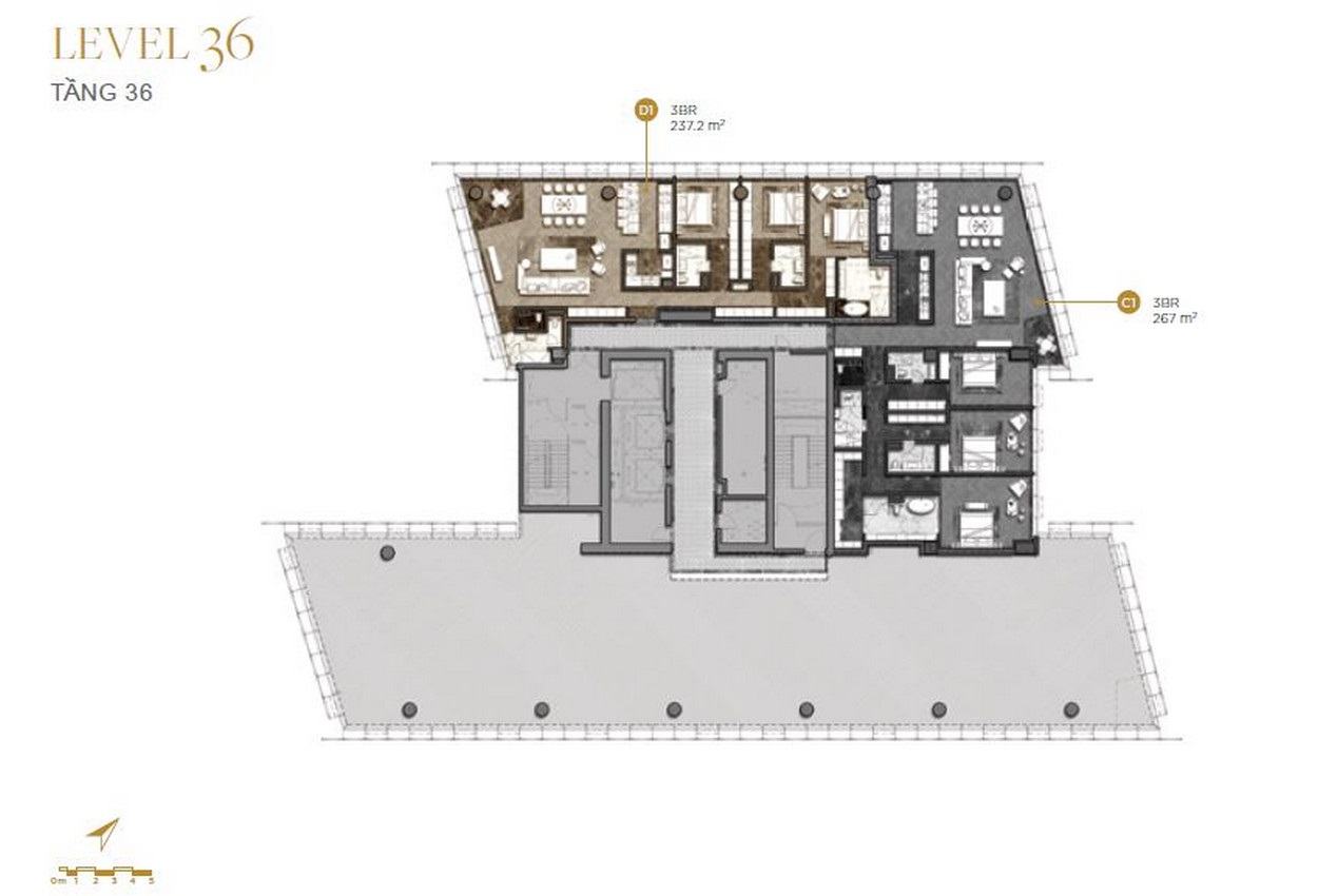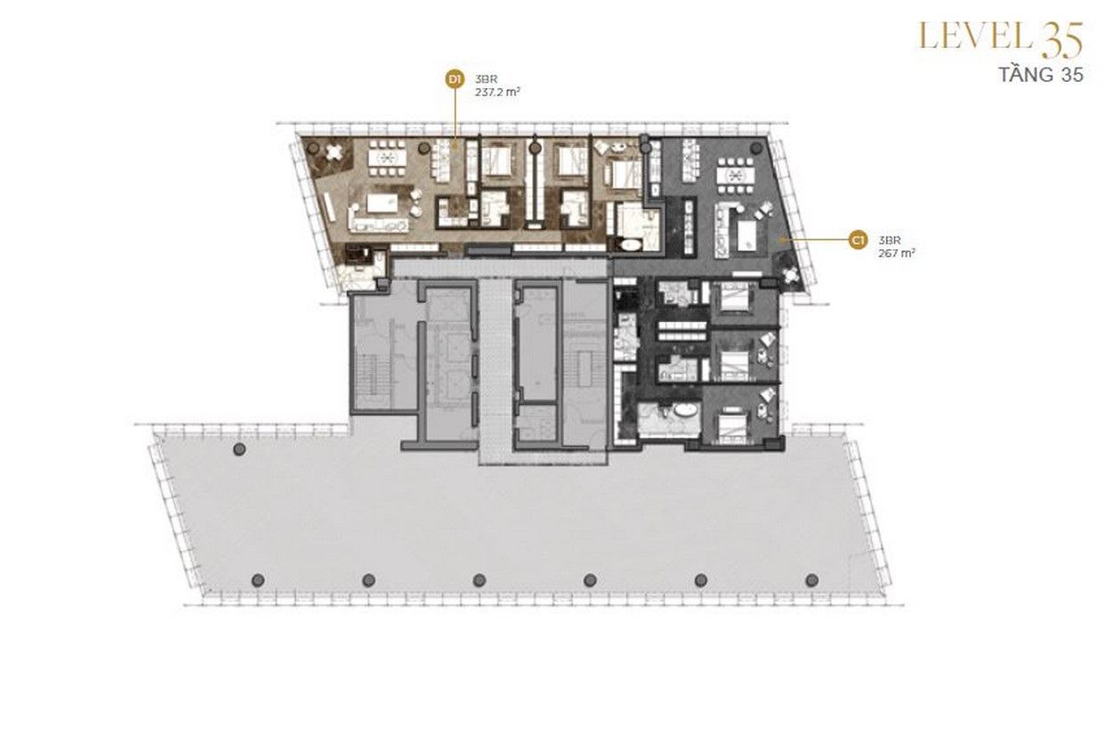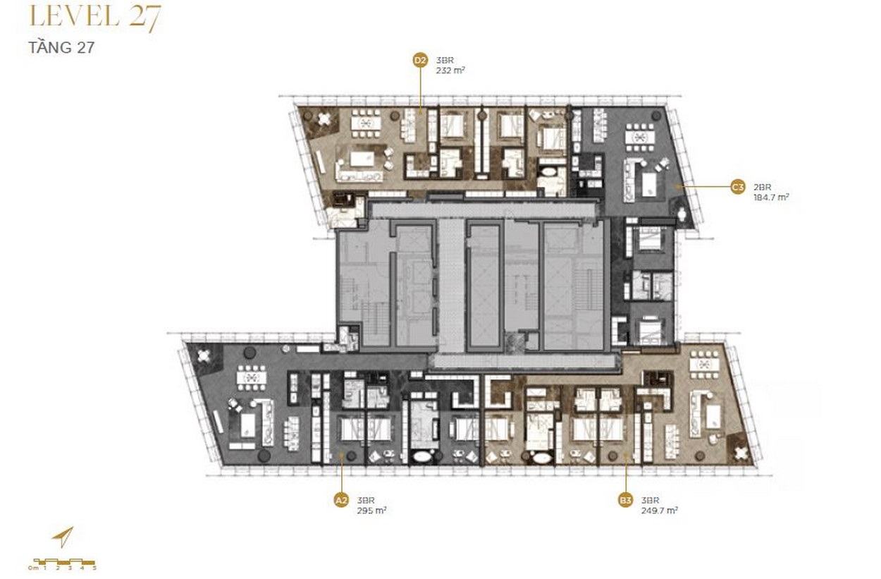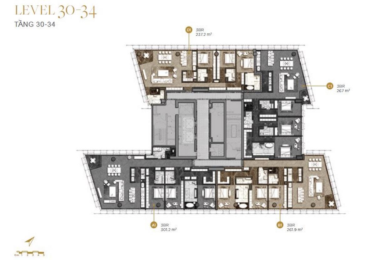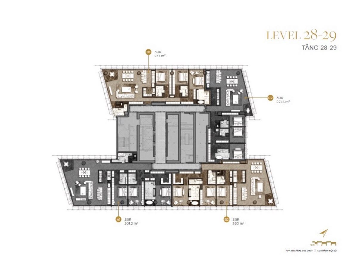 Diện tích căn 3Pn: 221m2 – 237,2m2 – 261,9m2 – 267m2 – 301,2m2.