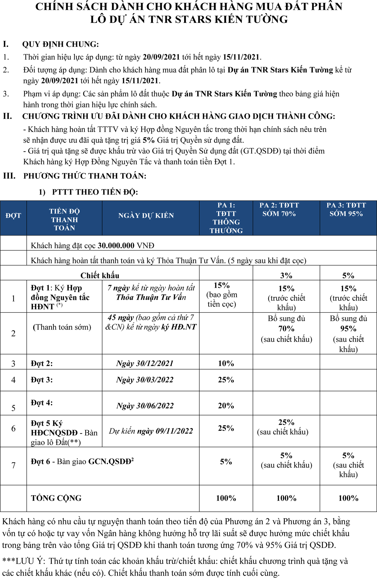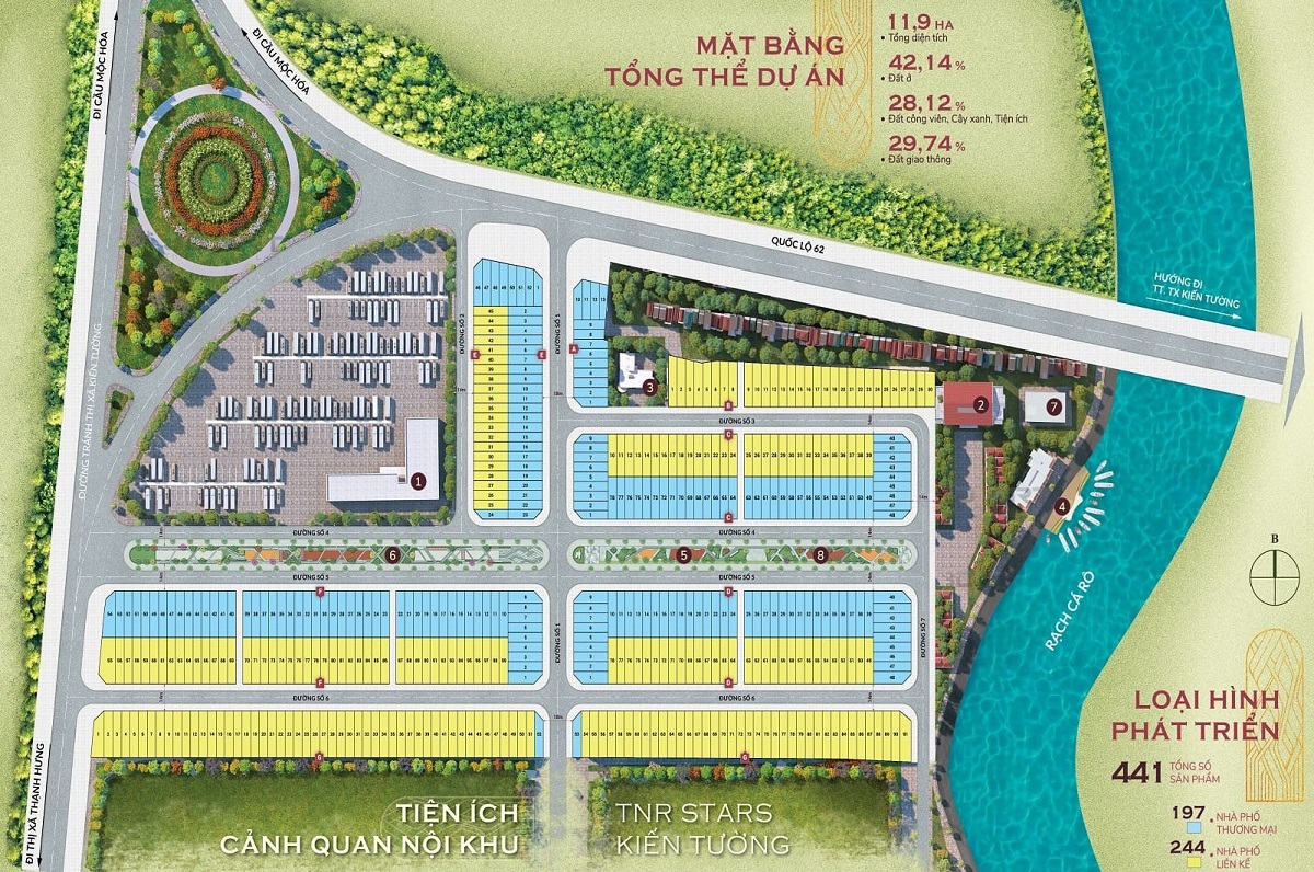 TNR Stars Kiến Tường được xây dựng trên khu đất có tổng diện tích 119.081,41 m2, trong đó diện tích dành cho đất ở 50.181,79 m2; công trình công cộng 33.487,87 m2; đất giao thông 35.411,75 m2.