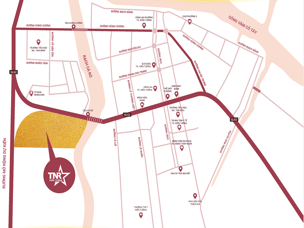 Dự án TNR Stars Kiến Tường tọa lạc ngay mặt tiền Quốc Lộ 62, thuộc phường 3, thị xã Kiến Tường, huyện Kiến Tường, tỉnh Long An. Theo kế hoạch, Quốc Lộ 62 sẽ được tiếp tục mở rộng bằng nguồn vốn của trung ương, qua đó, giảm thời gian di chuyển giữa Kiến Tường và Tân An (cách 68 km) và TP. HCM (cách 120 km).