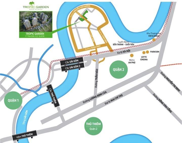 2. Tropic Garden đồng thời còn tọa lạc tại trung tâm của khu Thảo Điền – quận 2, có khung cảnh sông Sài Gòn thơ mộng. Vì thế mà dự án dễ dàng kết nối với các tuyến đường huyết mạch cách trung tâm Thủ Thiêm trong vòng 2 km, nhanh chóng di chuyển qua quận 1; quận Bình thạnh và quận 9.
