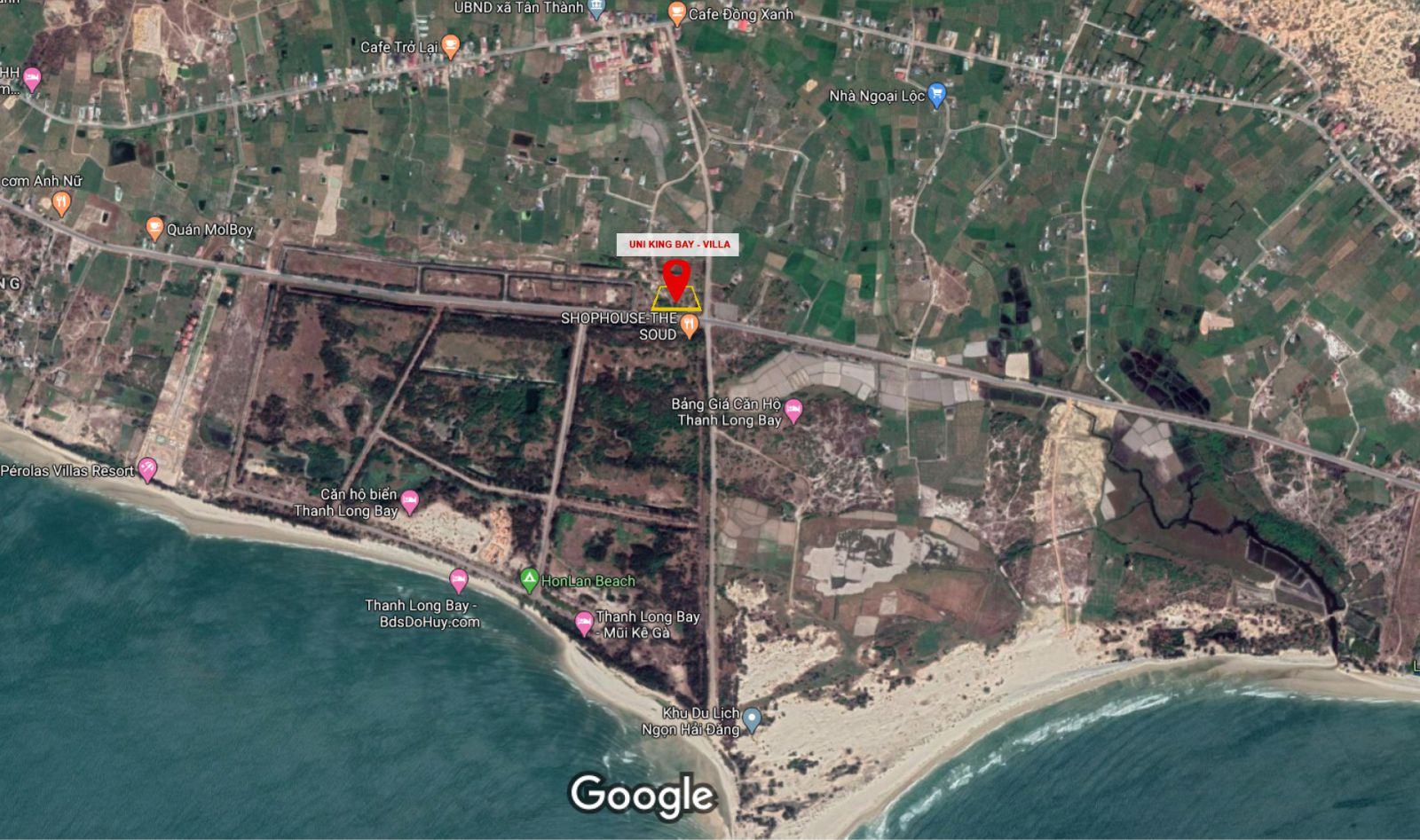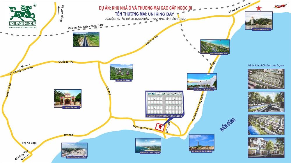 Cách đều trung tâm Tp. Phan Thiết và Tx. Lagi 30 phút đi xe, UNI KING BAY – VILLA nằm trên giao lộ DT719 và đường Hòn Lan Thị xã Lagi, Tỉnh Bình Thuận – Cách bờ biển Lagi 1,2 Km, một trong những bãi biển đẹp nhất Bình Thuận, nơi có danh thắng Mũi Kê Gà nổi tiếng.
