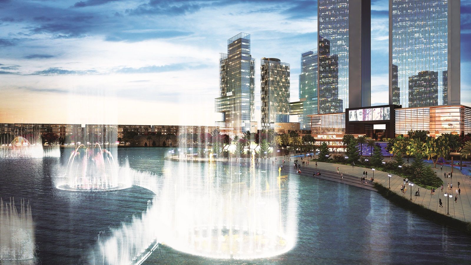 Quãng trường nhạc nước hoành tráng được đầu tư lên tới 100 tỷ đồng. Tập đoàn Vạn Phúc công bố khởi công công trình nhạc nước trên hồ Đại Nhật với công nghệ hiện đại và mới nhất từ Châu Âu. Công trình nhạc nước này được bố trí theo hình cánh cung hướng vào quảng trường Diamond được thiết kế gồm hơn 50 loại đầu phun trình chiếu phun nước rất phong phú và đẹp mắt với các vòi phun đa năng, vòi phun lửa… rất độc đáo trong đó cao độ dòng nước phun cao nhất ở độ cao 60-80m, rộng 120m-130m. Hệ thống vòi phun và ánh sáng sẽ hoạt động theo nhịp điệu âm thanh kết hợp sự chuyển động của màu sắc ánh sáng cùng với những bản nhạc, tác phẩm nghệ thuật sôi động, lôi cuốn tạo ra những màn trình diễn vũ điệu nước đẹp mắt và ấn tượng.