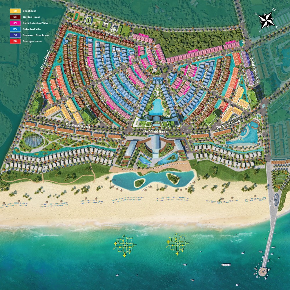 Với 3.979 sản phẩm, 3.000 căn hộ cao tầng & 681 nhà phố biệt thự thấp tầng (Sở hữu lâu dài), 80 Biệt thự biển & Shophouse (Sở hữu 50 năm). Quy hoạch dự án có hai trục đường chính rộng 25m: Da Vinci Road và Pavarotti Road.