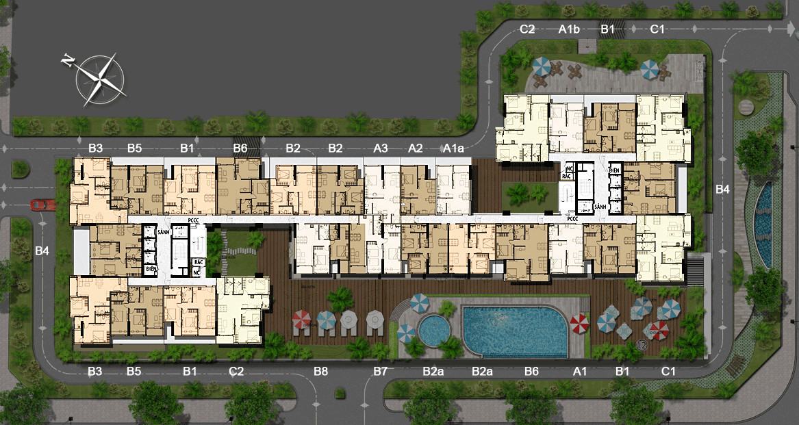 Mặt bằng mỗi căn hộ có từ 1 – 3 phòng ngủ + 1 phòng đa năng + 1 nhà vệ sinh + 1 lô gia.