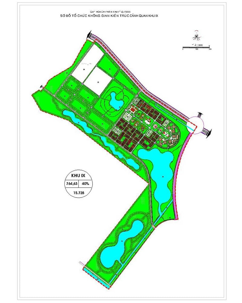 Và phân khu cuối cùng chính là phân khu IX. Nơi đây sở hữu diện tích tổng thể đạt 15.728ha. Mật độ xây dựng của phân khu chuẩn 40% cùng 764,63 diện tích cây xanh mặt nước.