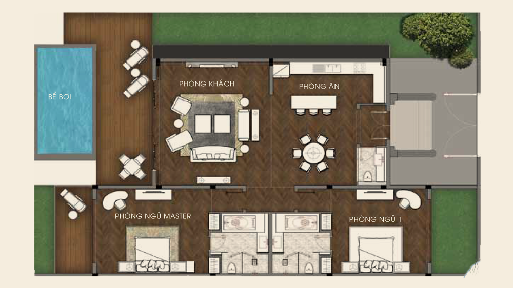 Biệt thự mẫu M1 gồm 2 phòng ngủ, 1 tầng : Số lượng 70 căn.