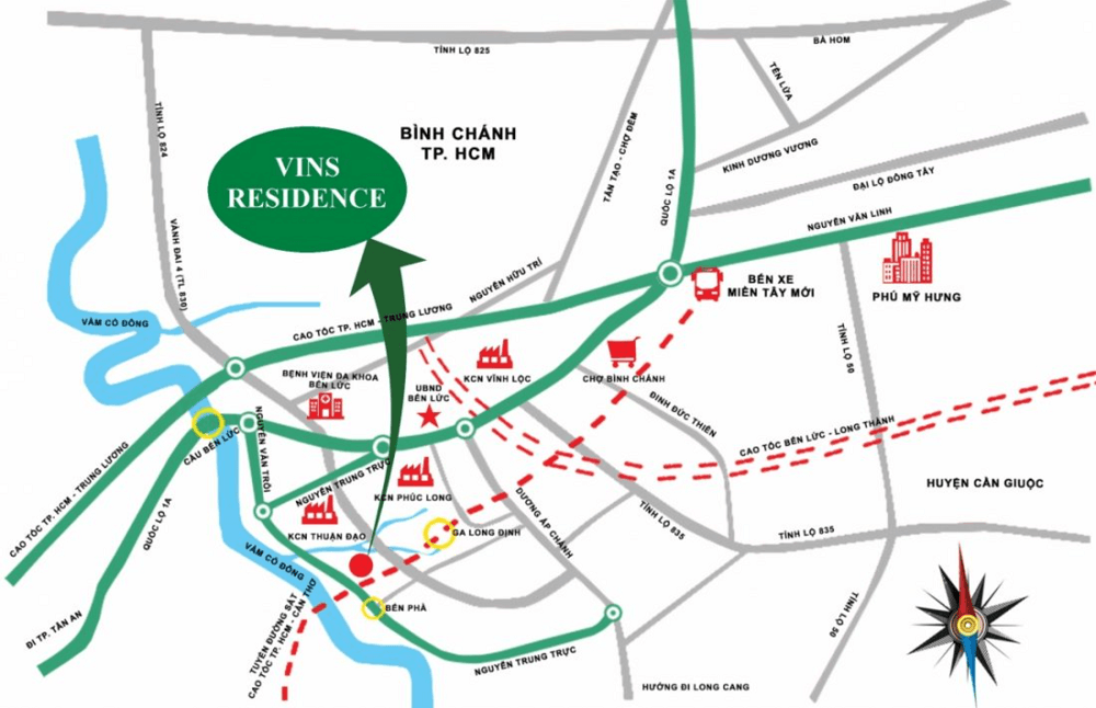 Dự Án Vins Residence nằm trung tâm hai mặt tiền đường Nguyễn Trung Trực và đường 833B, xã Long Cang, huyện Cần Đước, tỉnh Long An.Đây là tuyến đường huyết mạch kết nối trung tâm hành chính Bến Lức , quốc lộ 1A, liền kề với nhiều khu công nghiệp đang hoạt động.