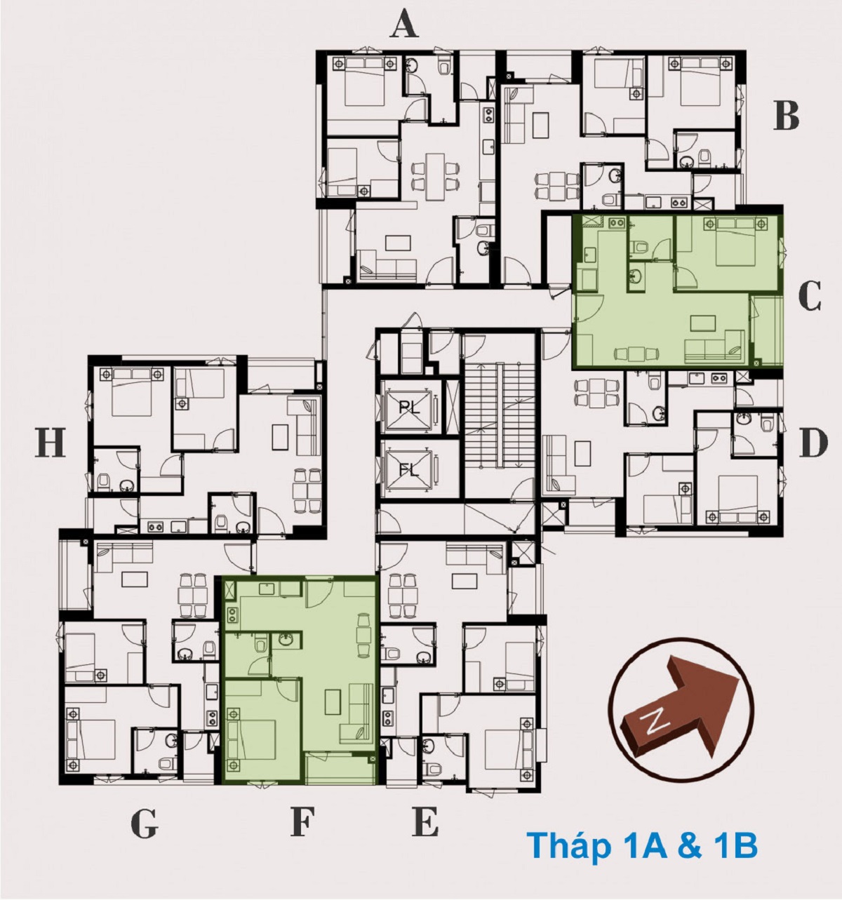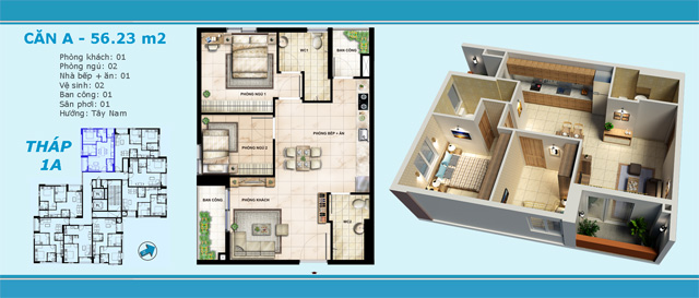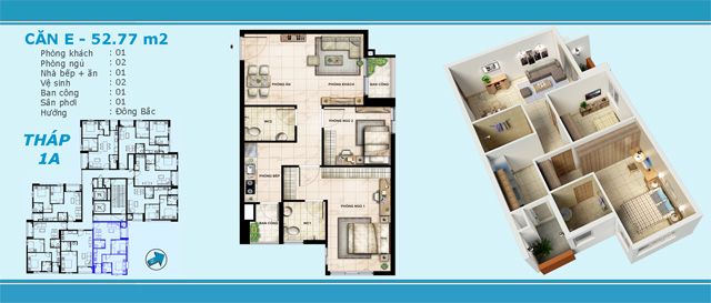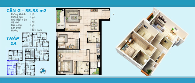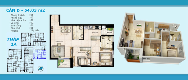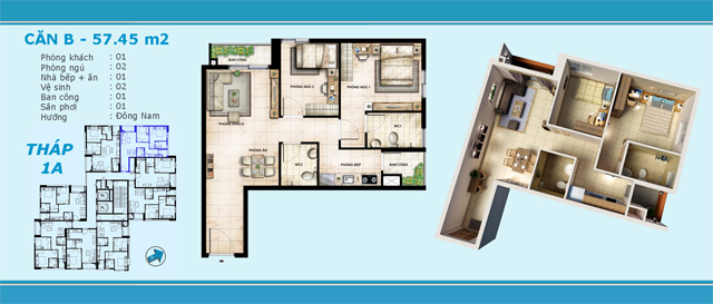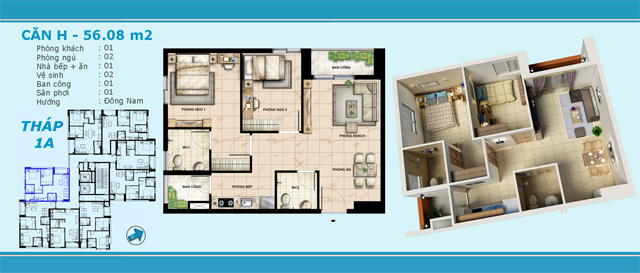 + Căn hộ 2PN: căn A – 56 m2; B – 57.47 m2; D – 54.03 m2; H -56.23 m2