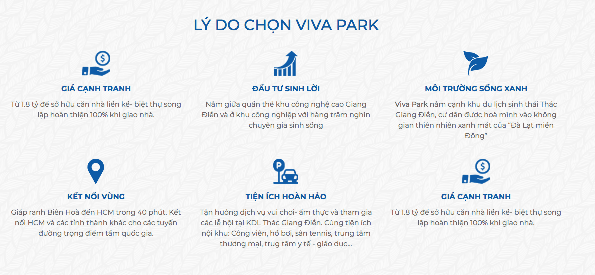 Bên trong dự án Khu đô thị thương mại Viva Park có các tiện ích nội khu như: Trung tâm y tế, Nhà sinh hoạt động đồng, Công viên Viva Rosa , TT thương mại, Trường mẫu giáo đẳng cấp, Quảng trường Cầu Vồng, TT thể thao – giải trí ngoài trời, hồ bơi, tennis….