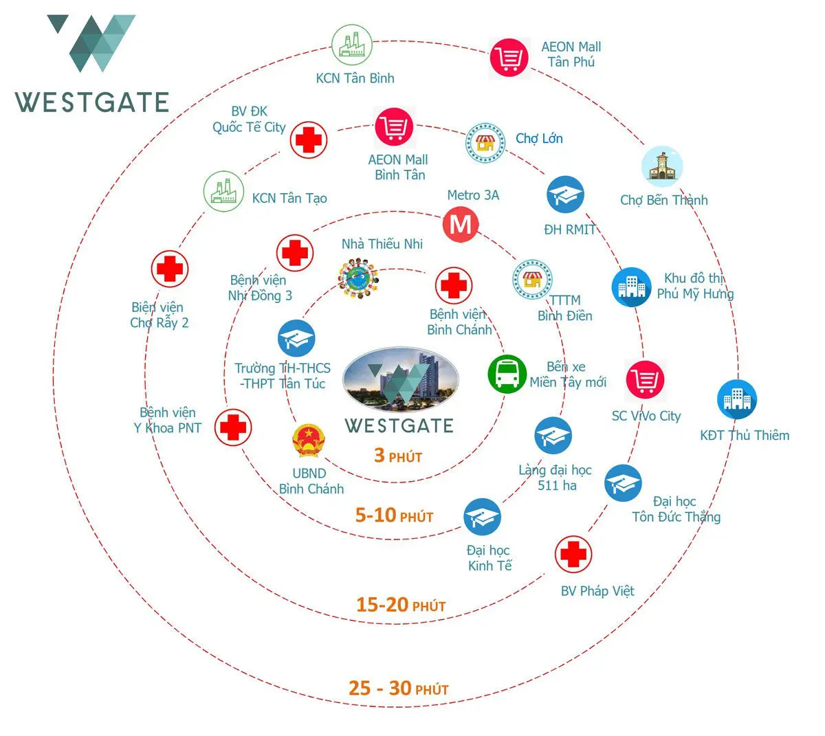 Đồng thời, trong tương lai, khi cầu Bình Tiên hoàn thành, kết nối tuyến đường Song Hành Quốc lộ 50 với đường Võ Văn Kiệt Quận 6 thì khoảng cách từ dự án chung cư Westgate Park về trung tâm Tp Hồ Chí Minh càng được rút gọn đáng kể. Theo đó, từ dự án Westgate Park tới đường Võ Văn Kiệt chỉ 5,5km, cư dân rất thuận đường để di chuyển đến các khu vực trong thành phố cũng như các tỉnh miền Tây.