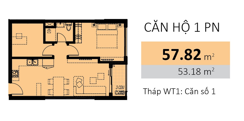 – Căn hộ 1 PN, diện tích 57,82 m2