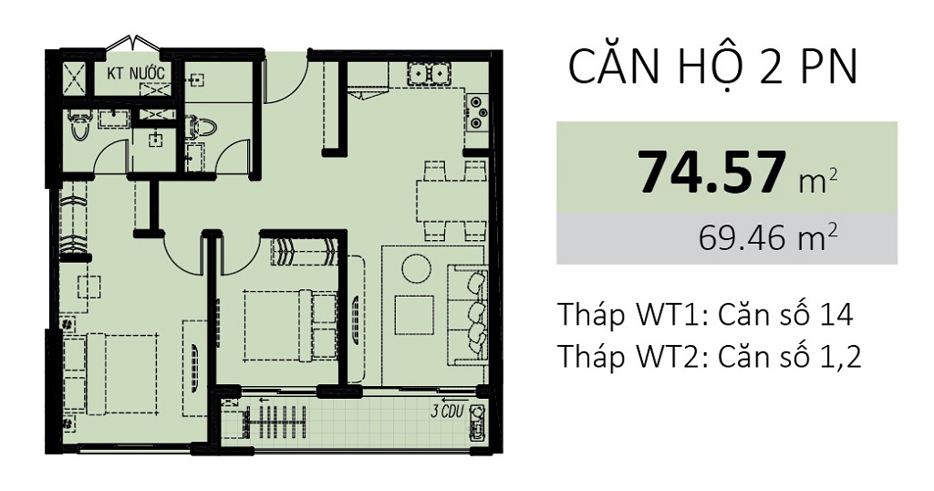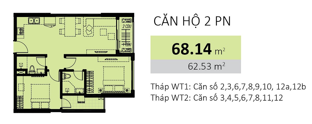 – Căn hộ 2 PN, diện tích từ 68 m2 – 74 m2