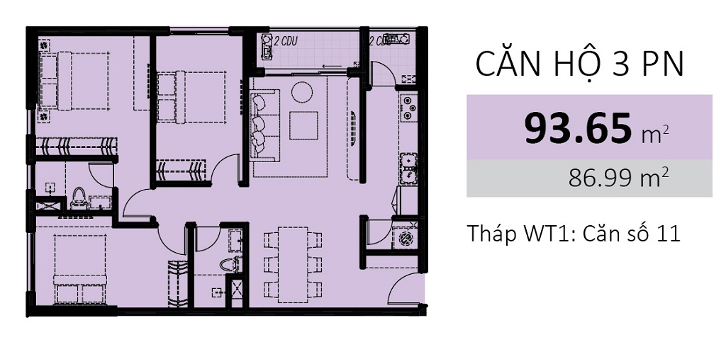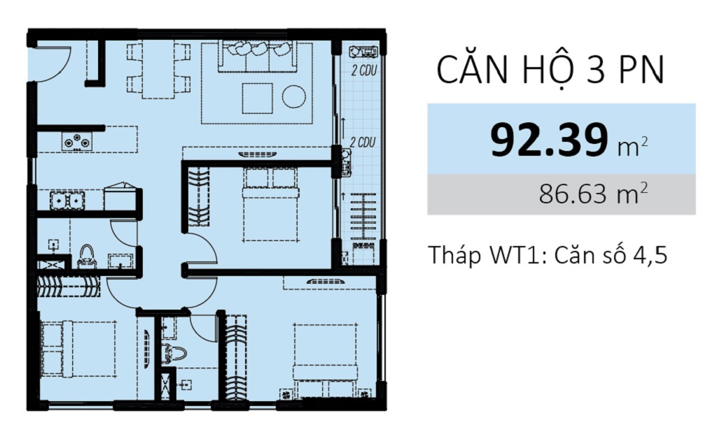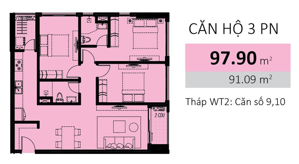 – Căn hộ 3 PN, diện tích từ 92 m2 – 97 m2