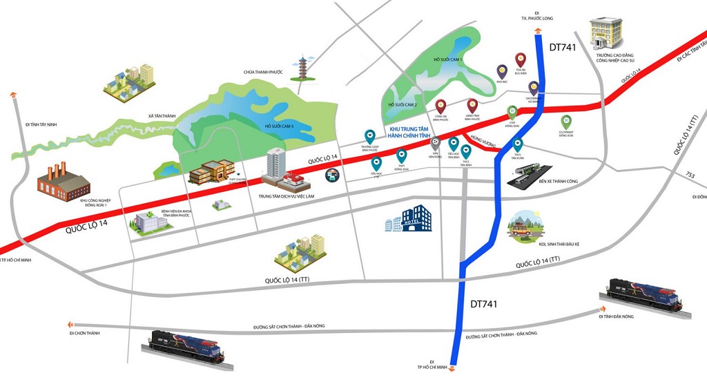 Vị trí dự án nằm trên trục đường Quốc lộ 14, TP. Đồng Xoài. Đây là tuyến đường mà các tỉnh vùng Tây Nguyên phải đi qua để đến tỉnh Bình Dương, TP. Hồ Chí Minh, tỉnh Đồng Nai, các tỉnh miền Tây và đặc biệt đây là tuyến đường giao thương với nước bạn Campuchia biên giới.