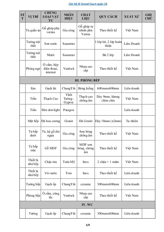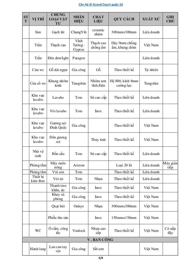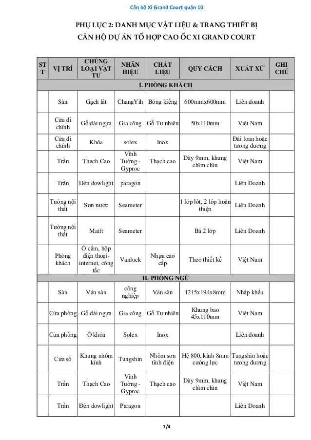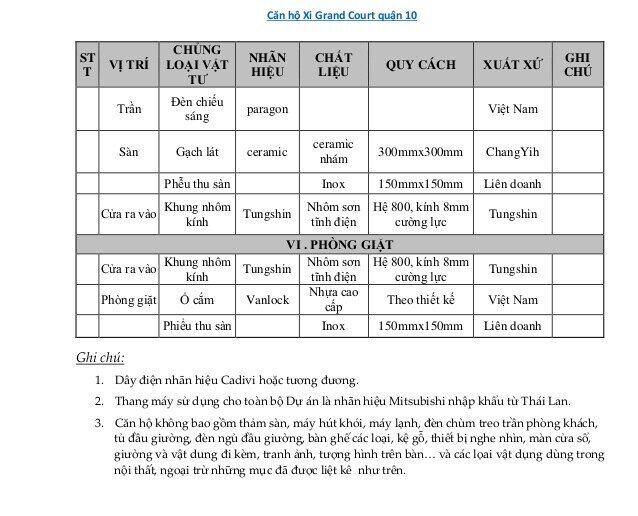 Phụ lục vật liệu bàn giao dự án Xi Grand Court tại Quận 10.
