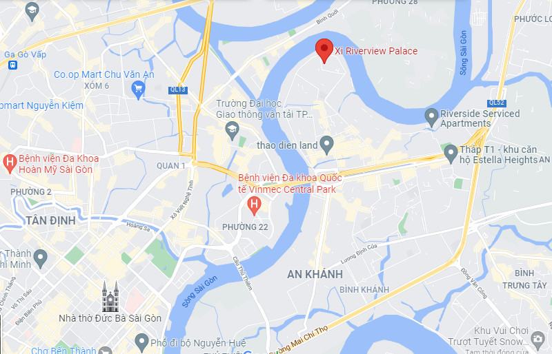 Xi Riverview Palace tọa lạc tại số 190 Nguyễn Văn Hưởng, phường Thảo Điền, Tp. Thủ Đức, Tp. Hồ Chí Minh. Từ dự án, cư dân dễ dàng liên kết nhanh chóng với các khu vực lân cận, trung tâm thành phố nhờ hệ thống hạ tầng giao thông phát triển nhanh chóng.