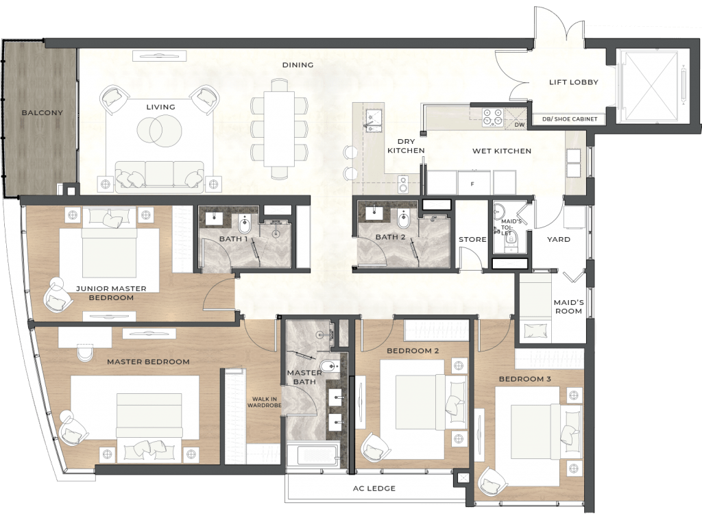 Với chiều cao trần lên đến 3m ở phòng khách, nhà bếp, phòng ăn và phòng ngủ, mỗi căn hộ tại Thu Thiem Zeit River đều có không gian rộng rãi, khoáng đạt. Các thiết bị và nội thất chất lượng cao nhập khẩu từ Châu Âu được trau chuốt và lựa chọn kỹ lưỡng, nhằm thể hiện phong cách và gu thẩm mỹ tinh tế của gia chủ.