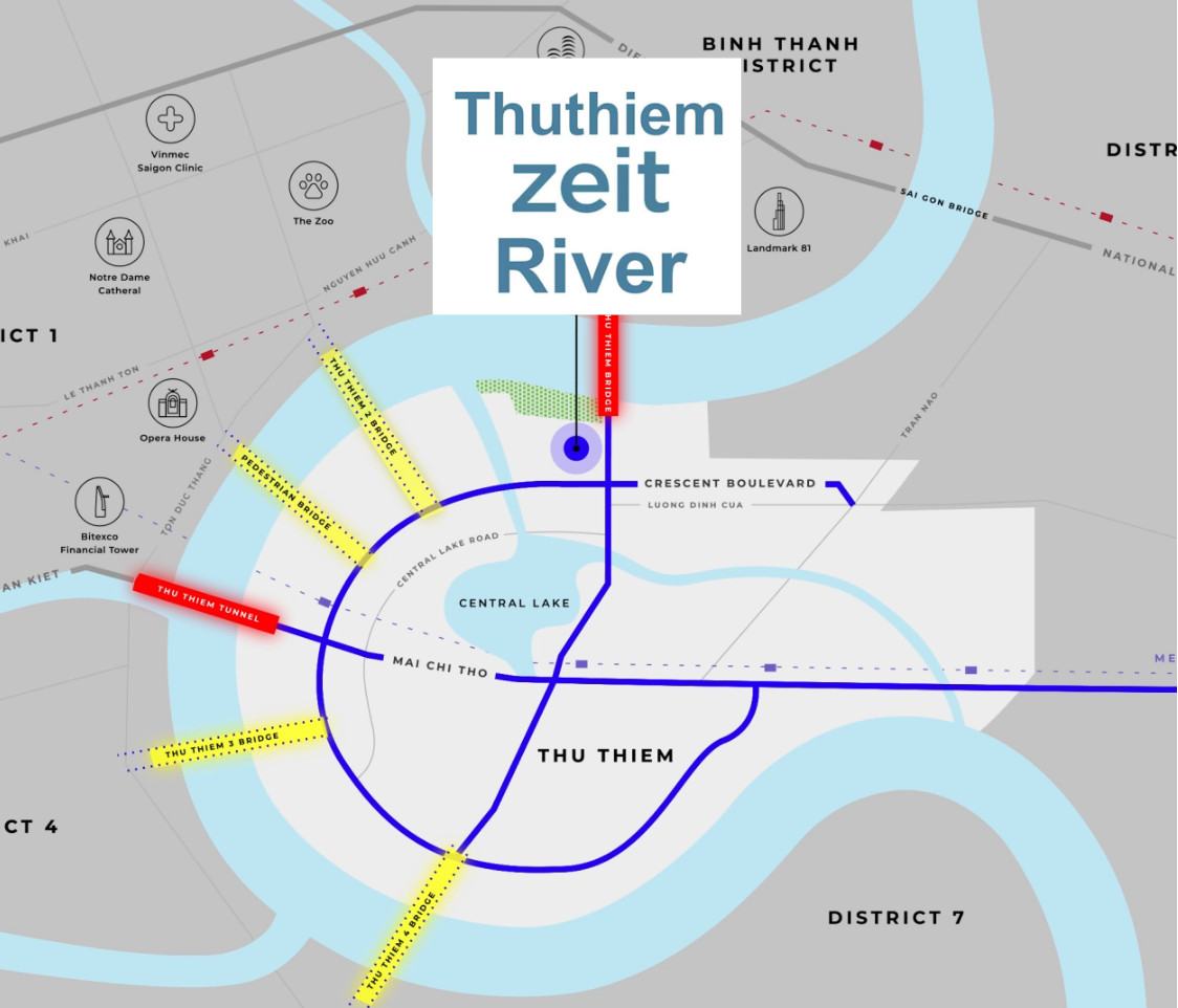 Với lợi thế nằm tại trung tâm Thủ Thiêm sầm uất, nên kết nối của dự án Xi Thủ Thiêm giao thông thuận tiện, đặc biệt là di chuyển qua các cây cầu kết nối trọng yếu như :