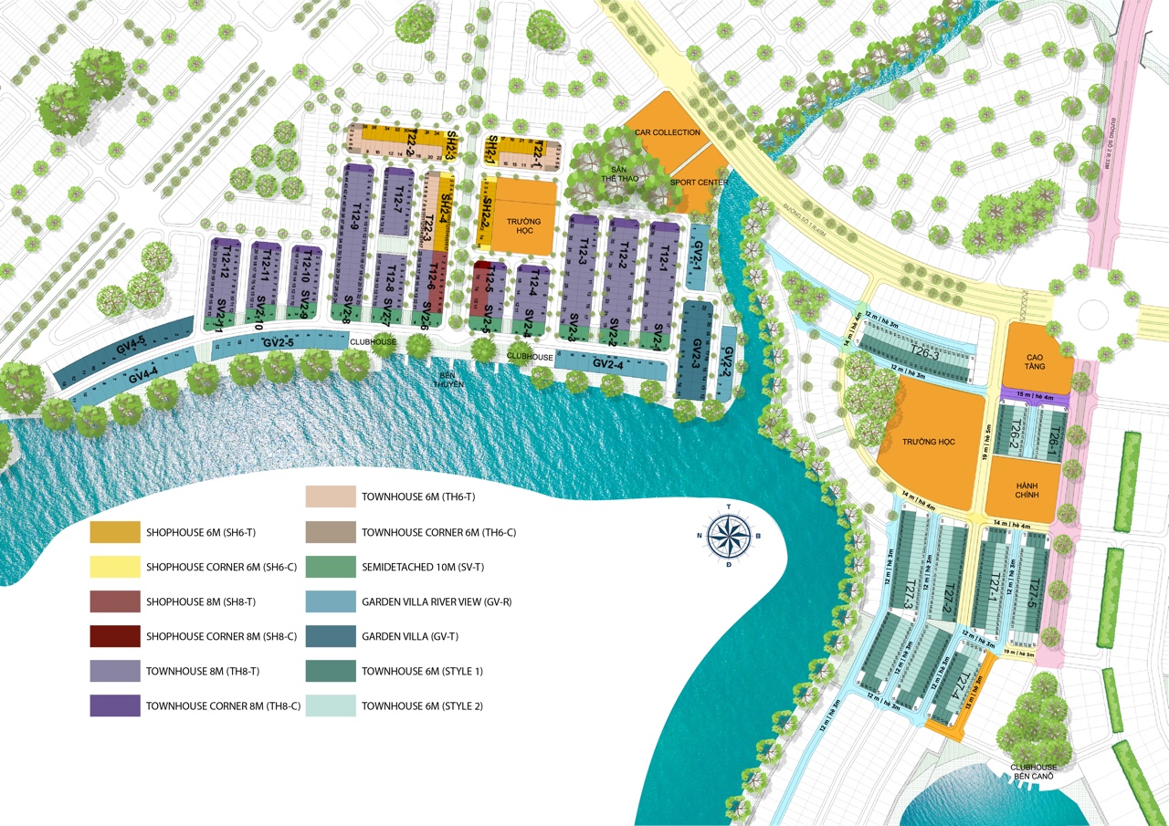 - Diện tích nhà phồ liền kề: Town House 6x20m Type 1 – 2; Town House Corner 6x20m; Town House 8x20m; Town House Corner 8x20m; Town House Corner 10x20m