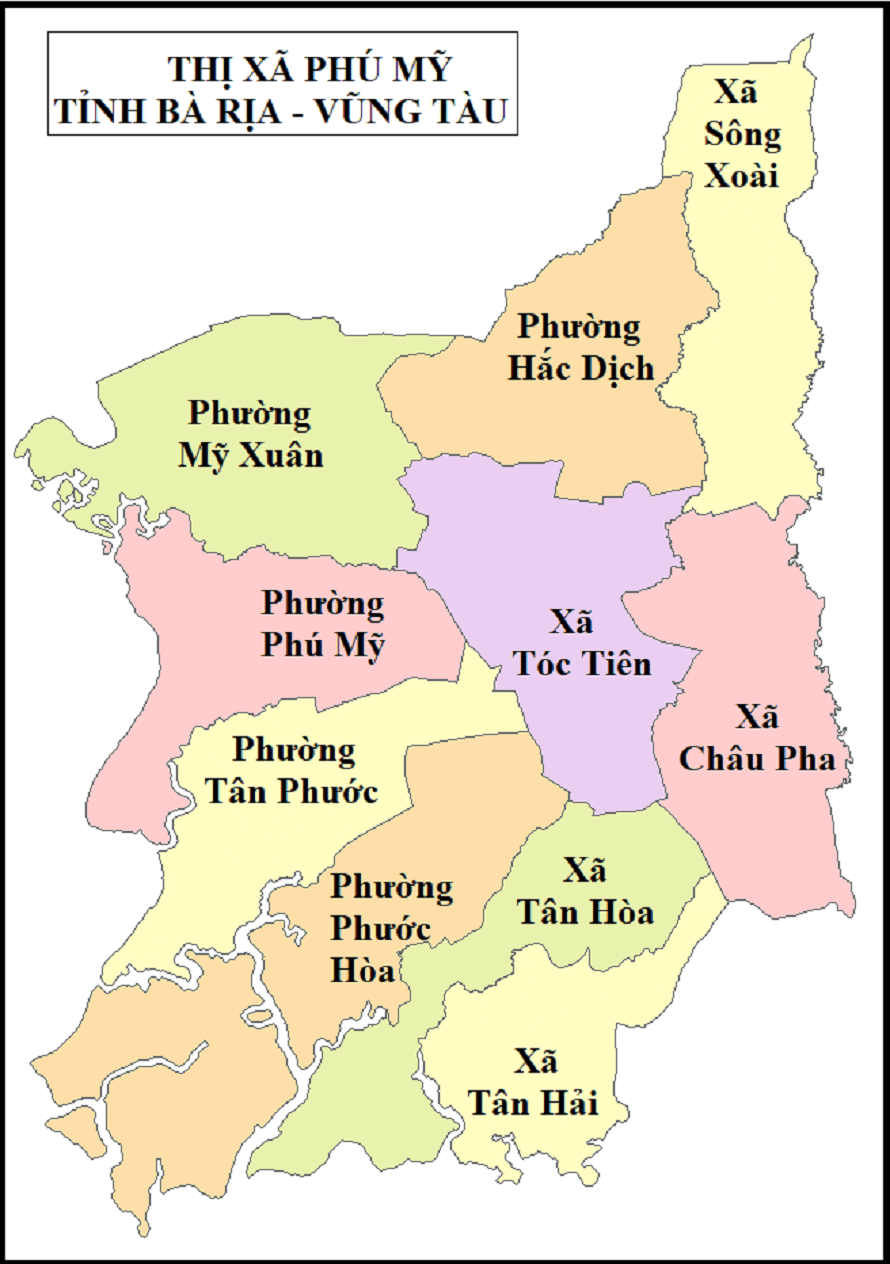 – Sau khi thành lập, thị xã Phú Mỹ có 333,84 Km2 diện tích tự nhiên và 175.872 người với 10 đơn vị hành chính cấp xã, gồm 5 phường: Hắc Dịch, Mỹ Xuân, Phú Mỹ, Phước Hòa, Tân Phước và 5 xã: Châu Pha, Sông Xoài, Tân Hải, Tân Hòa, Tóc Tiên.
